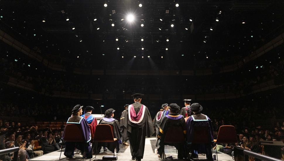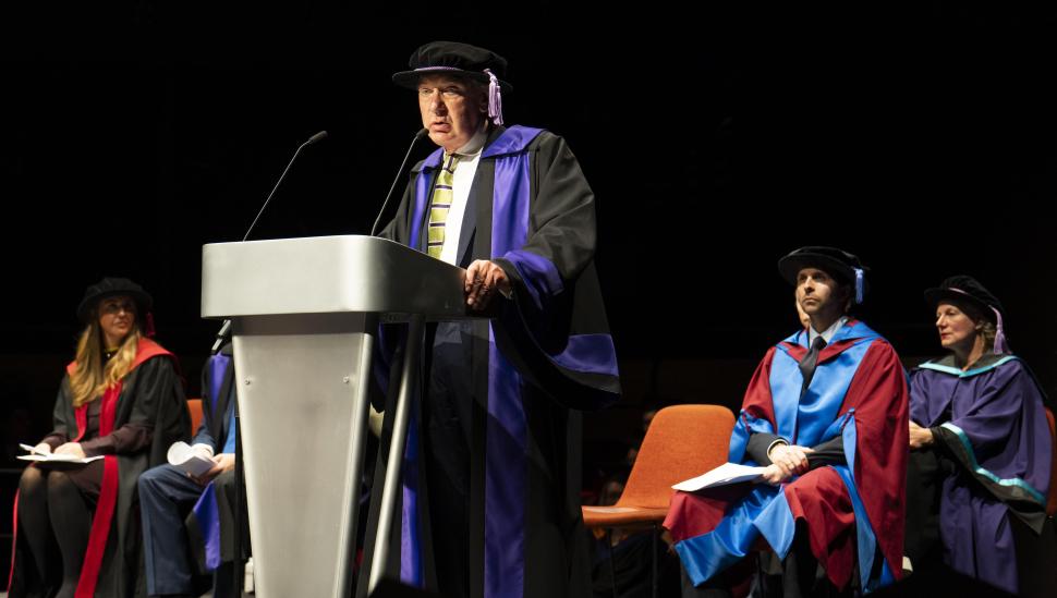 Once the audience was seated, the platform party — including senior staff and members of LAMDA’s Board of Trustees — proceeded to the stage. Speeches were shared, celebrating the soon-to-be graduates, who will now join a global community of thousands of LAMDA alumni working across the creative industries as actors, directors and technicians.